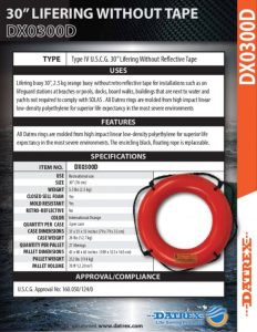 Liferingbuoy 30″, 2.5 kg orange buoy without retro reflective tape For installations and yachts not required to comply with SOLAS . All Datrex rings are molded from high impact linear low-density polyethylene for superior life expectancy in the most severe environments. The becket/grab lines are replaceable.