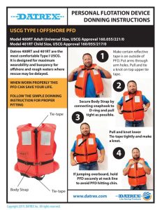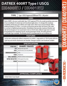 Datrex 400RT and 401RT are the most comfortable Type I USCG approved PFD in the market providing many years of use in multitude of commercial and recreational applications. It is designed for maximum wearability and buoyancy for offshore and rough waters where rescue may be delayed. With a minimum buoyancy of 24 lbs., it can turn an unconscious person from face down in the water to a vertical or slightly backward position. Polyethylene foam provides maximum flotation and will not lose buoyancy if cut or punctured. Sewn on SOLAS retro-reflective tape meet or exceed all requirements for commercial vessels carrying passengers for hire. The safest and most comfortable Type I available. This flotation device is recommended for use in offshore use.